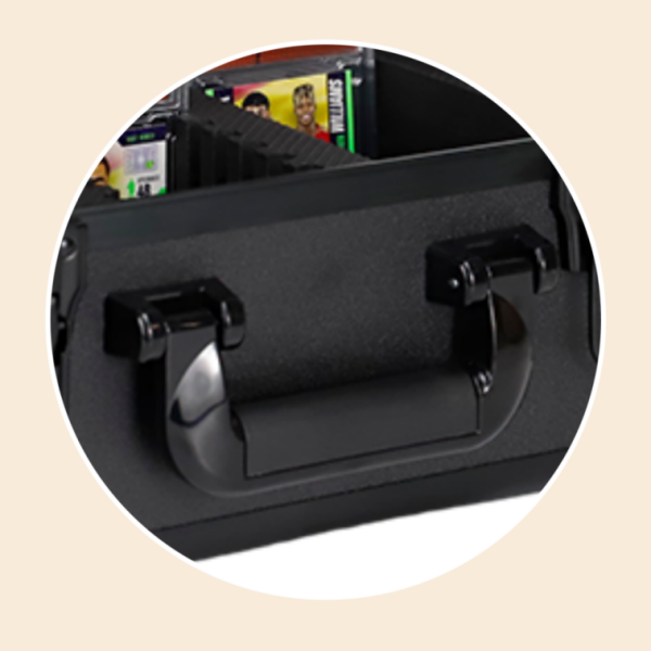 The ergonomic handle is designed for easy portability, allowing collectors to carry their cards without strain. Its reinforced attachment ensures durability, while the smooth grip makes it comfortable to transport the case to shows, events, or personal storage spaces.